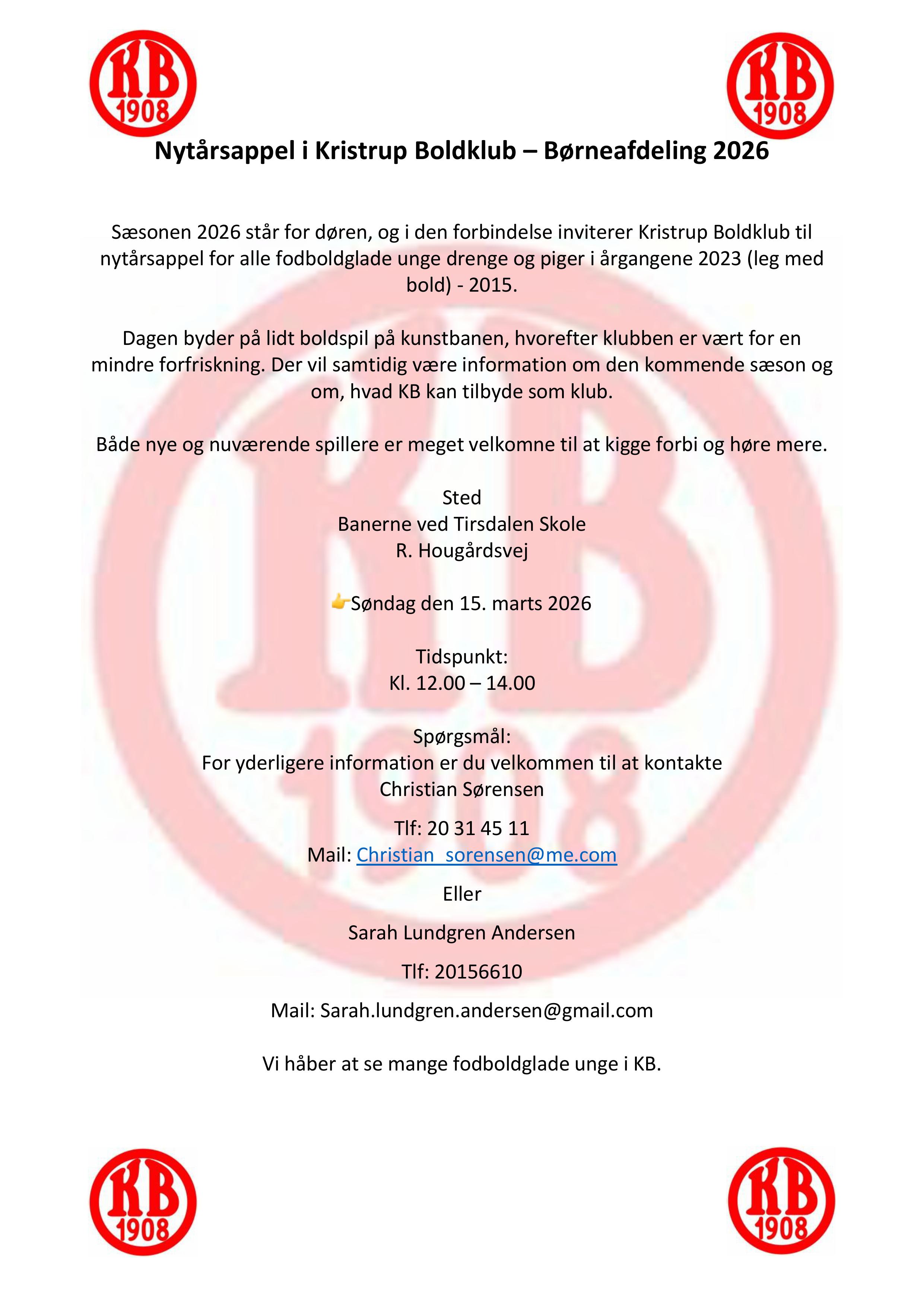 Sæson 2026 står for døren, og vi inviterer alle fodboldglade drenge og piger (årgang 2015–2023 – leg med bold) til nytårsappel i KB.